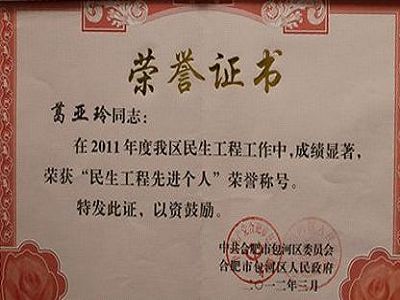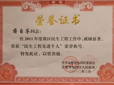 城投公司葛亞玲、蔣自倉兩位同志在2011年度包河區民生工程工作中,,,,,,,成績顯著,,,,,,,獲包河區區委、區政府授予的“民生工程先進個人”光榮稱號。。。。。。。